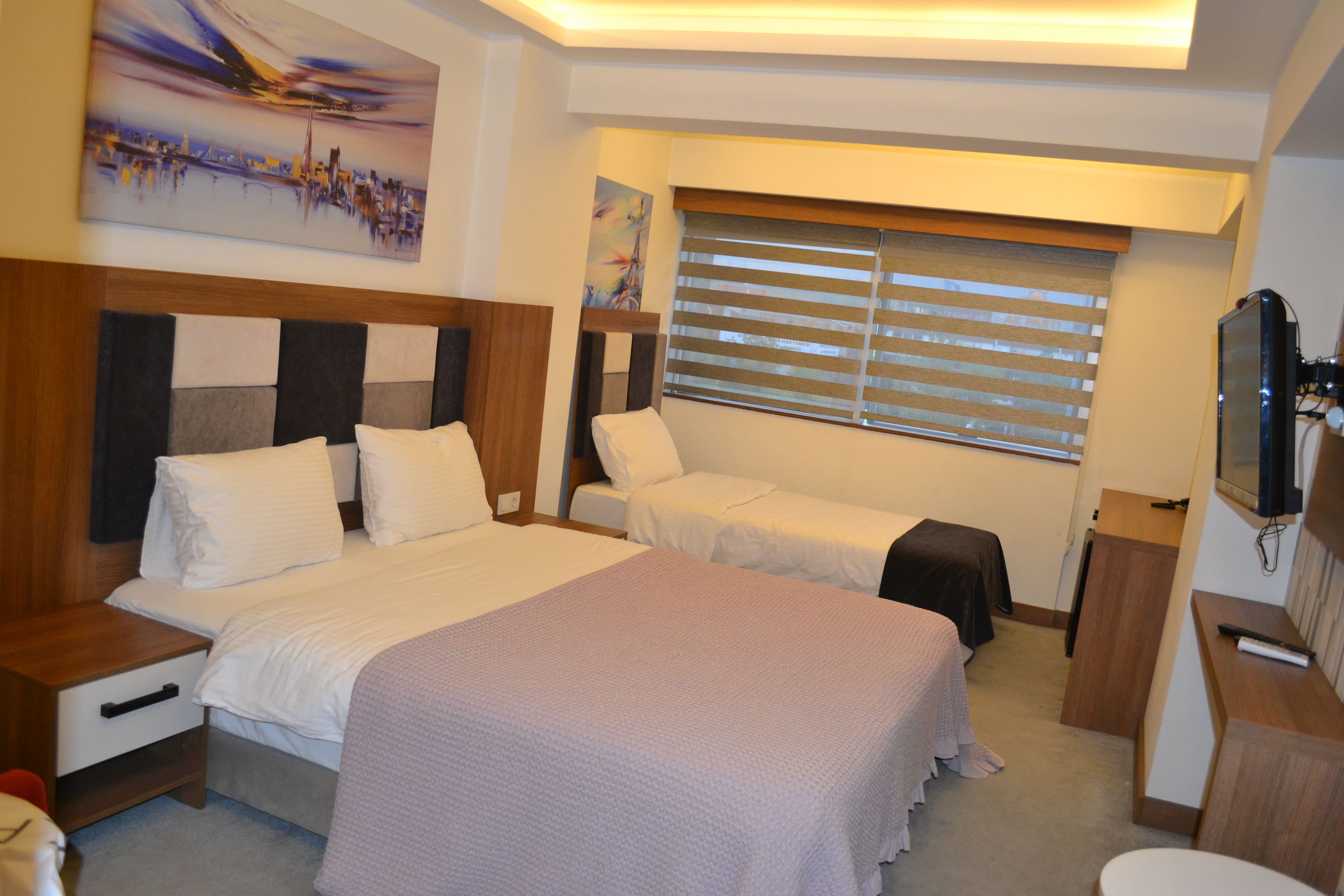 In rooms with one large bed and one single bed, we offer satellite TV with 32” Full HD, kettle service, a work desk, and high-speed internet. Upon request, additional baby cribs or rollaway beds can be placed in the room, but this may cause some crowding.